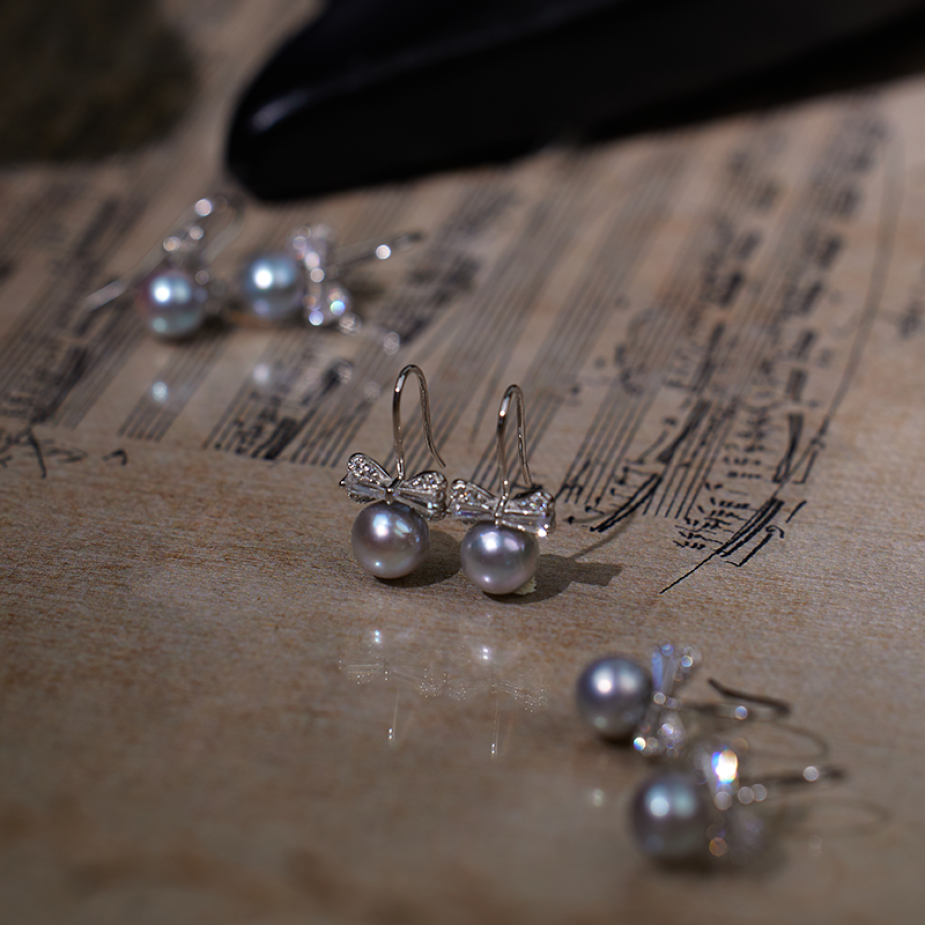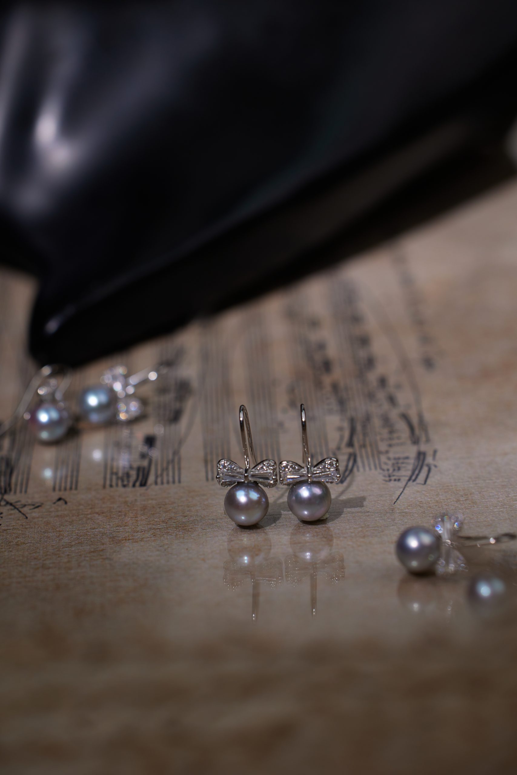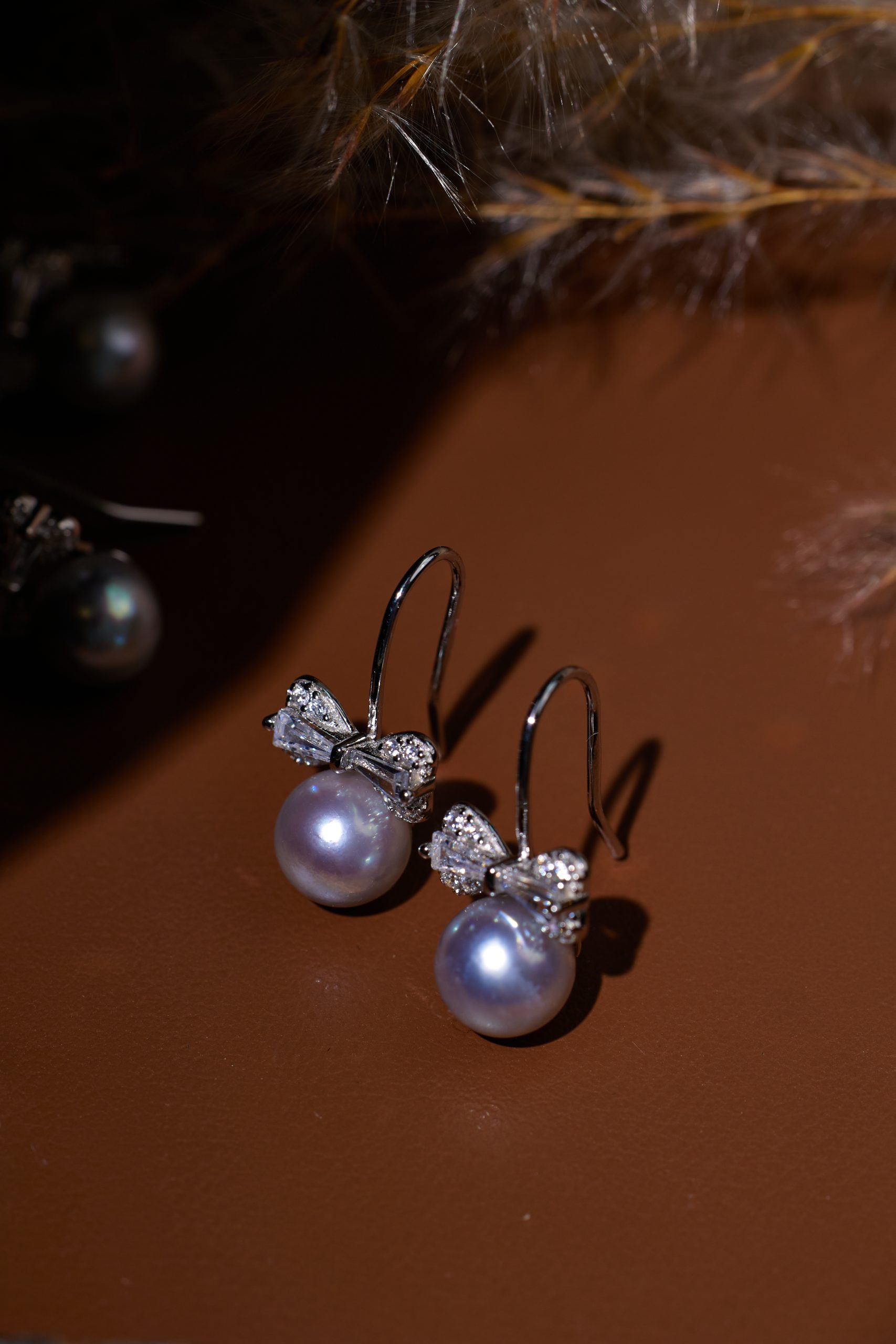 Hongqiao Pearl, Akoya Pearl Earring Hook, Silver-Blue Gray, Bow Style P365