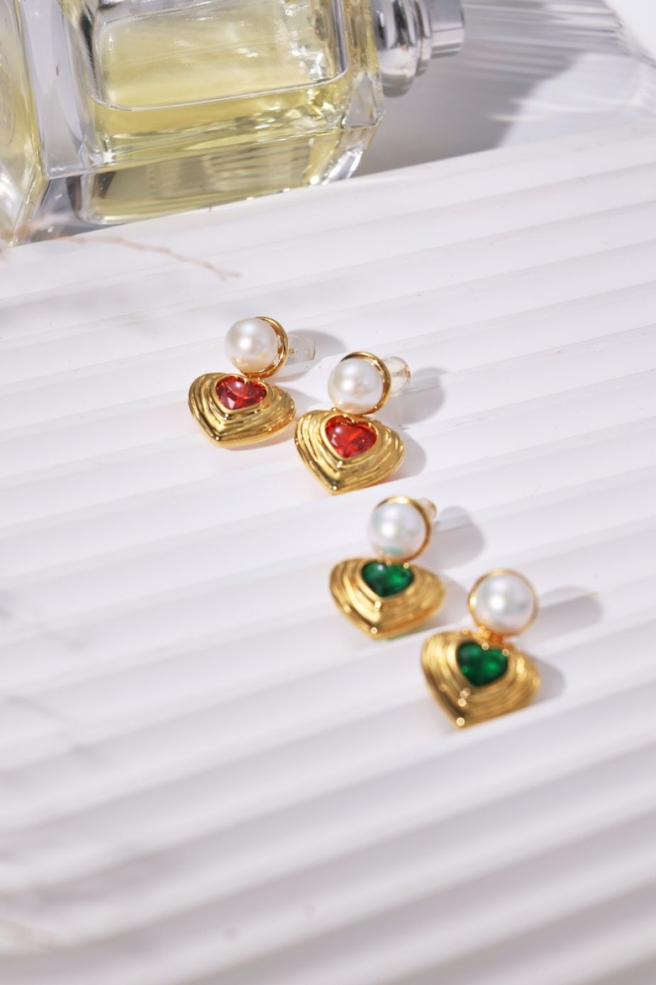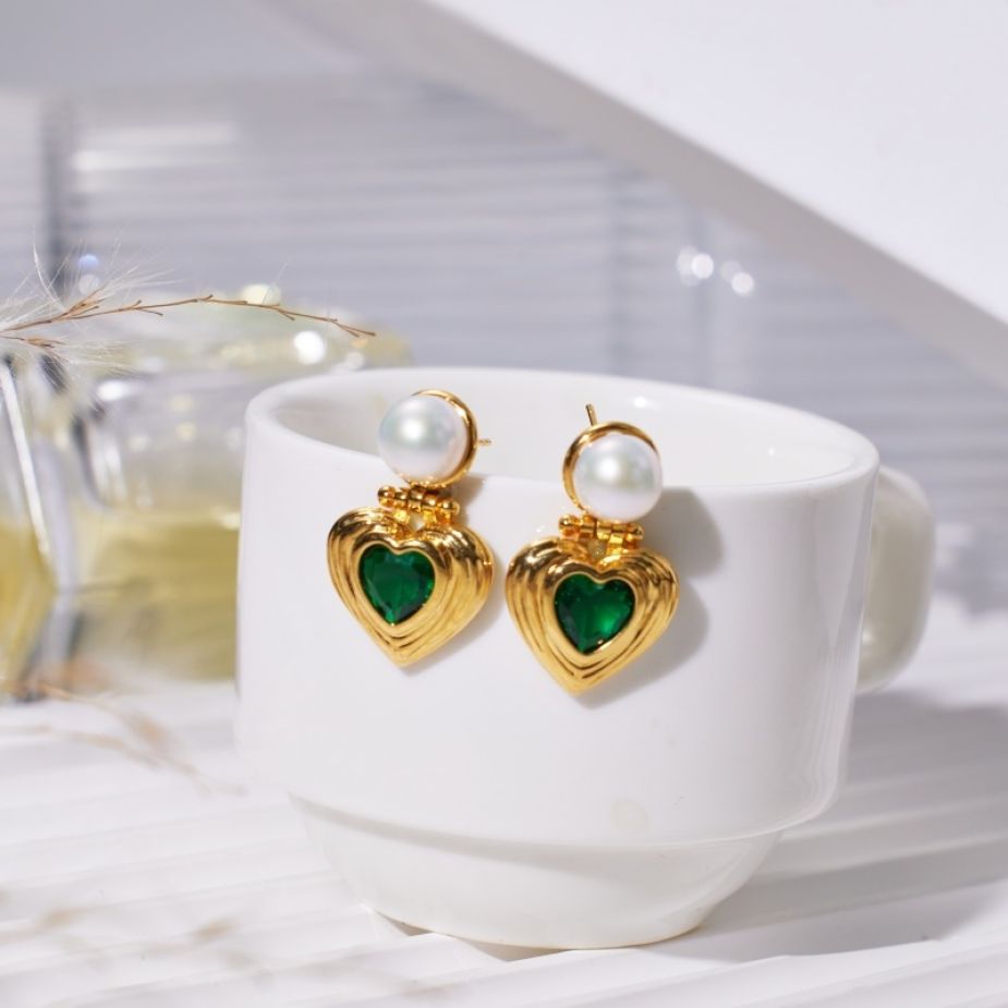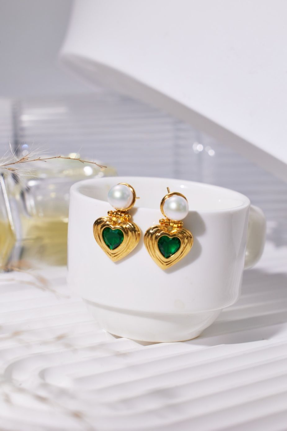 Hongqiao Pearl, Freshwater Pearl Earrings, Inlaid with Green Zircon, Vintage Heart Style HQEH01003